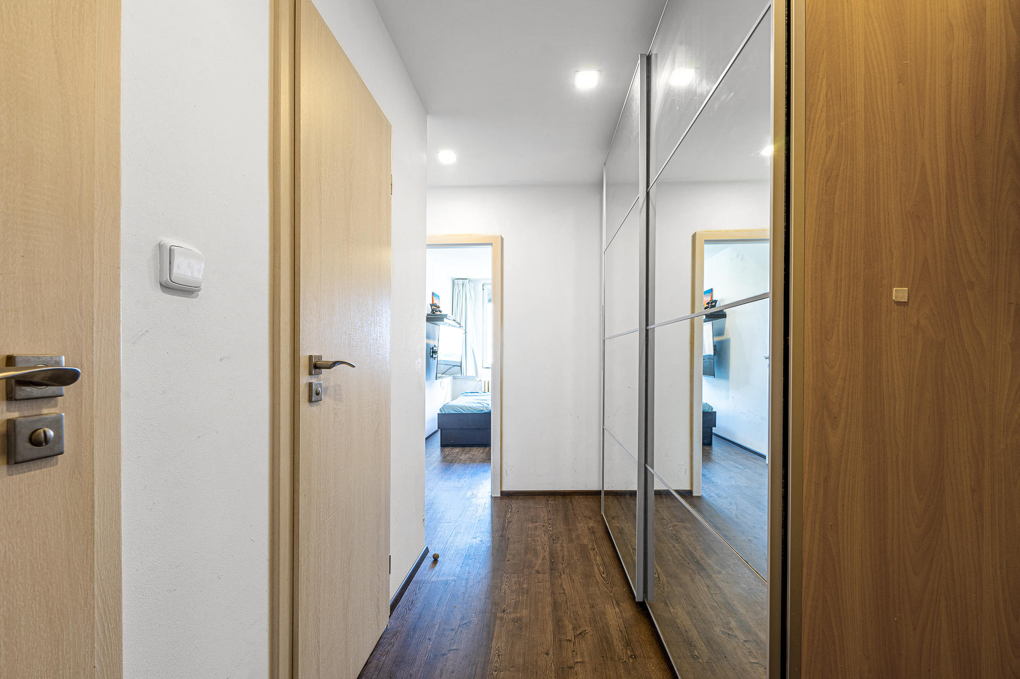 Obě místnosti jsou orientovány na východ, což oceníte zejména v létě. V chodbě je dostatek úložného prostoru a to formou krásné velké skříně s prosklenými posuvnými dveřmi v moderním stylu.
