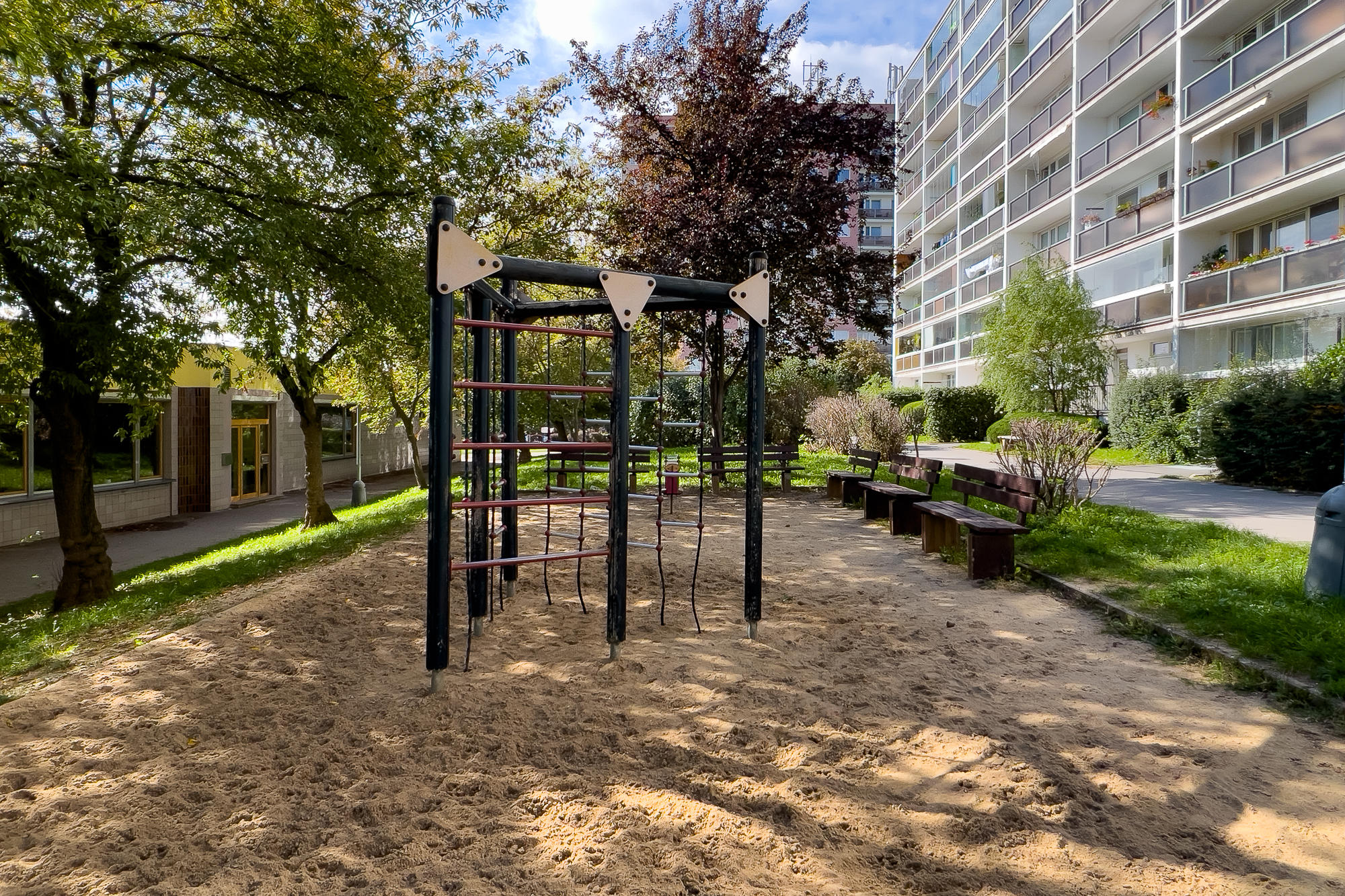 Za panelovým domem je hriště na fotbal a basektball. Pinpongové stoly a nově postavená fontána. Celkem 5 míst v rádiusu 200m kde jsou prolézačky - děti se tu nudit nebudou.